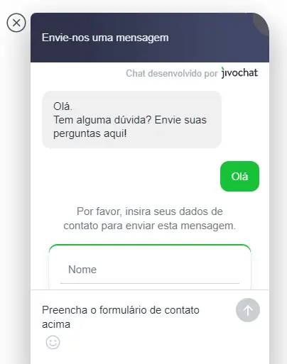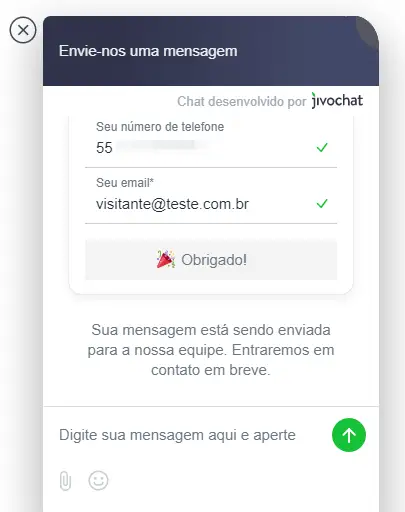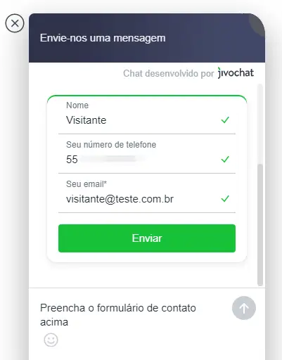 Após escrever uma mensagem, o visitante visualiza um formulário para deixar os dados de contato para que seja possível enviar a mensagem para a sua equipe. Isso é muito importante e necessário para que sua equipe consiga entrar em contato com o visitante por e-mail ou telefone para responder a mensagem deixada por ele/ela.