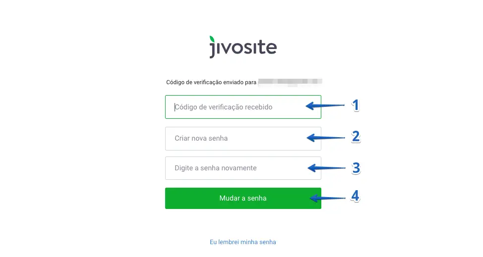 4.Insira o código de verificação no campo "Código de verificação recebido" (1), digite sua senha no campo "Criar nova senha" (2), repita a senha no campo "Digite a senha novamente" (3) e clique no botão "Mudar a senha" (4).