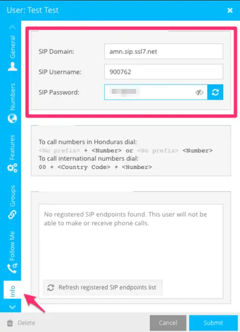 - No painel do seu SIP, acesse a área de Usuários e crie um novo usuário para obter um Domínio SIP, Usuário e Senha, os quais precisará para se conectar ao nosso serviço.