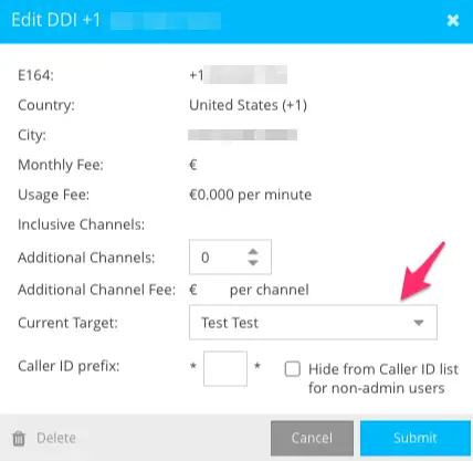 - Acesse as configurações do seu número SIP e redirecione todas as ligações para o novo usuário criado ou um usuário já existente, caso já tenha uma conta de usuário, selecionando o usuário como "Alvo" ("Current Target") do número de telefone.