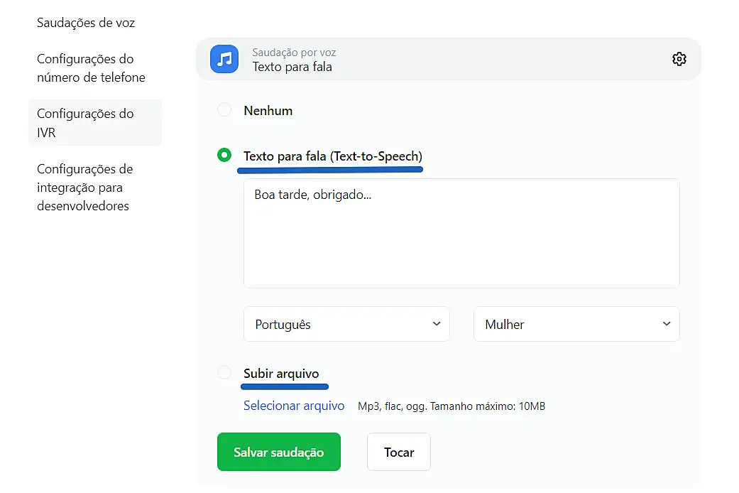 No início do algoritmo está "Saudação". Na saudação, é necessário dar voz às opções disponíveis para o cliente (por exemplo: "Boa tarde! Para entrar em contato com a compra, pressione 1, se tiver alguma dúvida sobre entrega, pressione 2, etc."). A frase pode ser escrita em texto e o robô irá reproduzi-la, ou você pode enviar seu próprio arquivo de áudio.