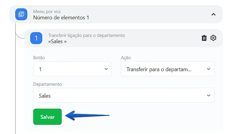 Após a criação dos departamentos, você pode prosseguir diretamente para a configuração do menu de voz.