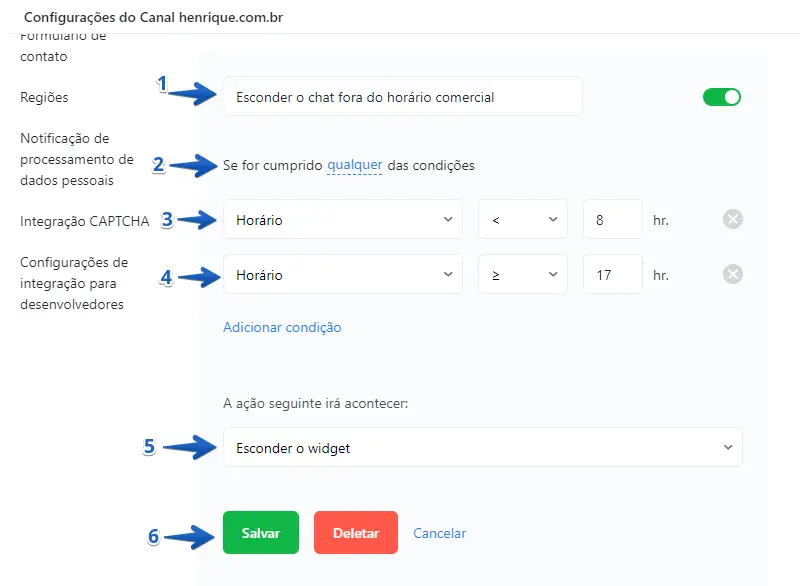 Caso queira esconder o chat por completo em dias específicos, basta selecionar a condição "Dia da semana" ao invés de "Horário", selecionar o dia desejado e usar o operador "=" (igual à).