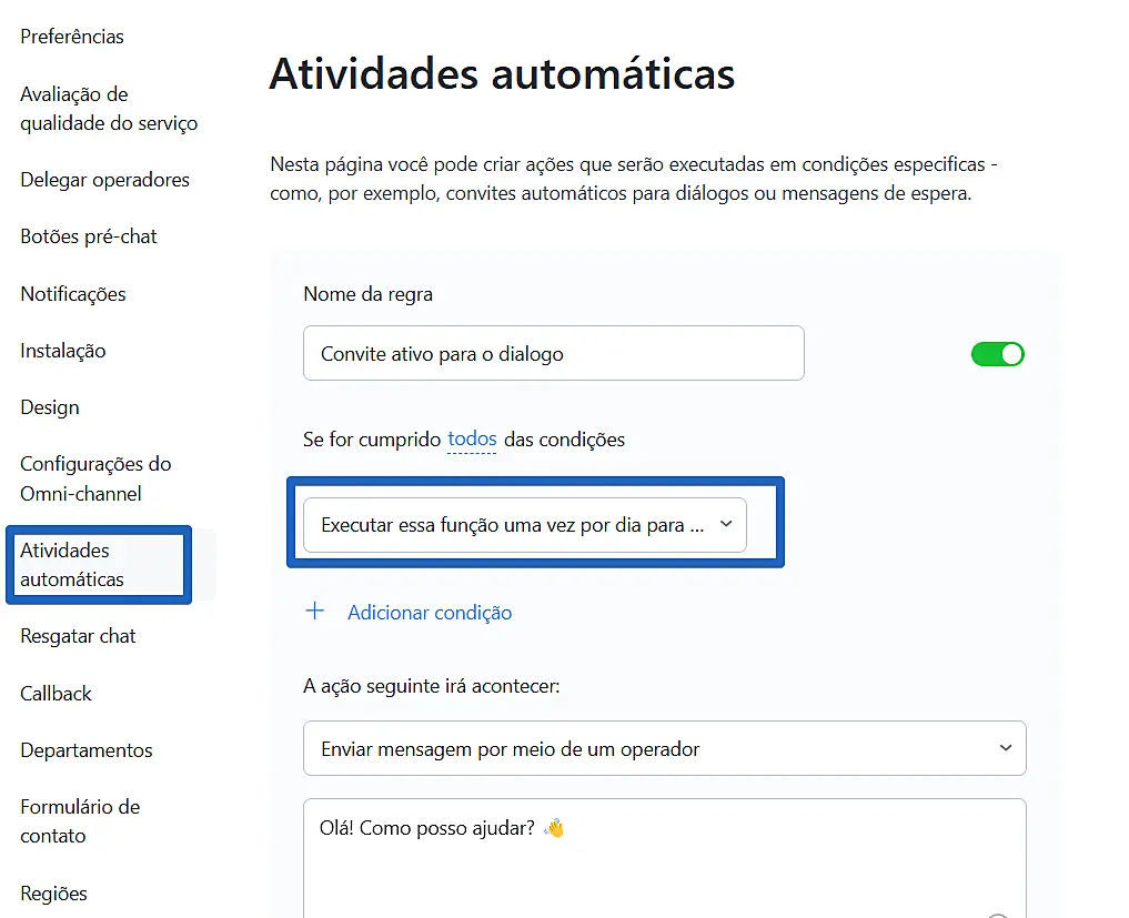 Se seus visitantes reclamam que a janela do chat está subindo toda hora e atrapalhando a navegação na página, você pode ajustar suas atividades automáticas de acordo com as instruções a seguir.