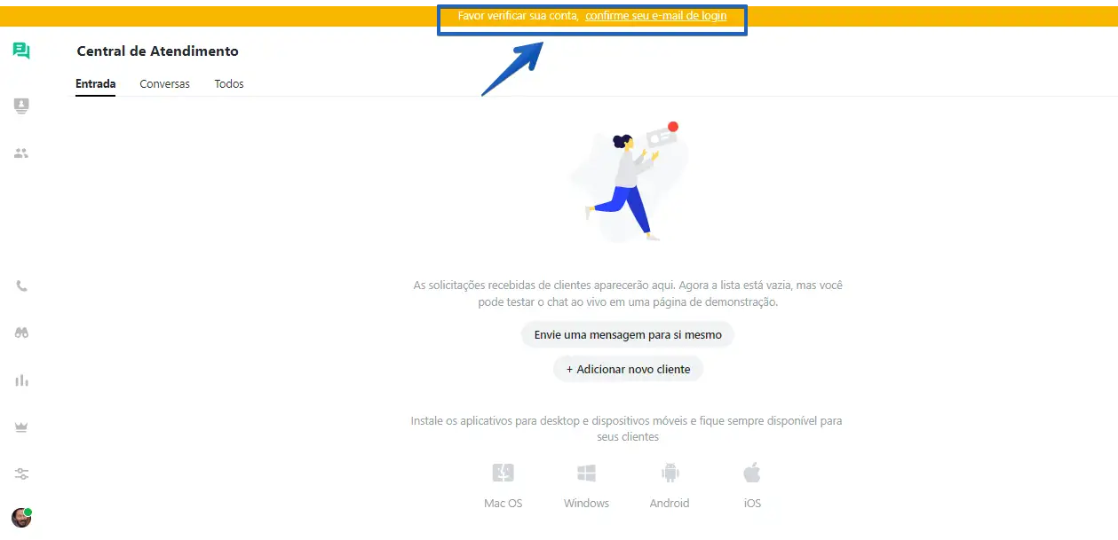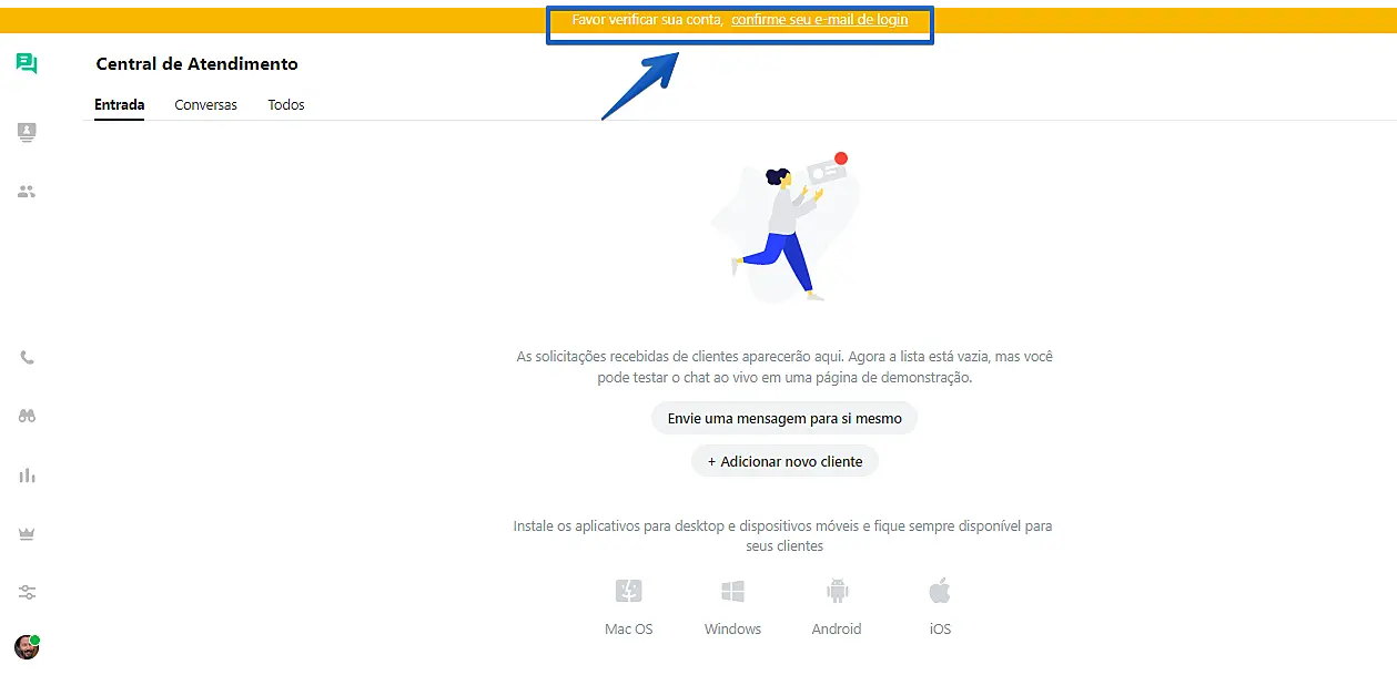 - Até que o e-mail seja verificado, você verá esta notificação em todas as sessões do aplicativo JivoChat: