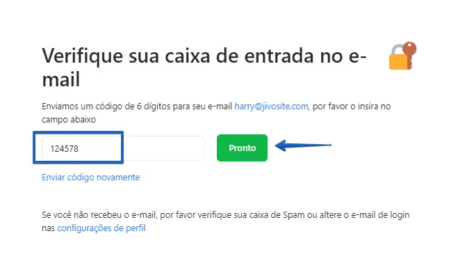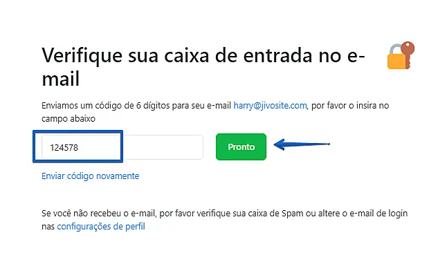 - Clique em verifique seu endereço de e-mail > o código será enviado para o e-mail cadastrado > preencha o formulário que será aberto no aplicativo inserindo o código de 6 dígitos que chegou ao seu e-mail: