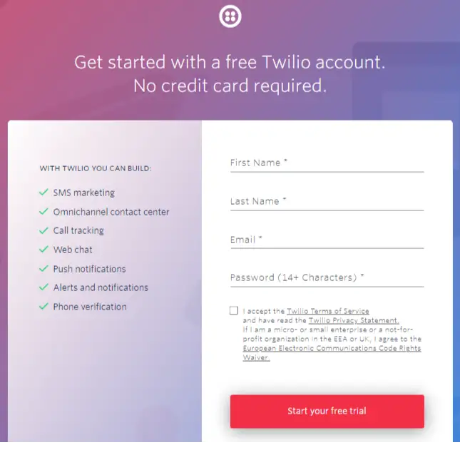 Para criar sua conta no Twilio, acesse o site do Twilio, clique em Sign up and start building ou clique diretamente aqui e você verá a seguinte página (não é necessário nenhum cartão de crédito, o cadastro é totalmente gratuito).