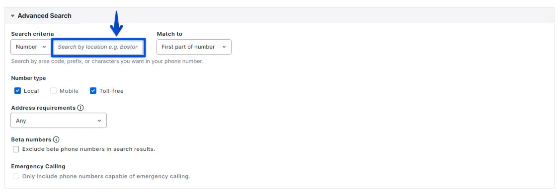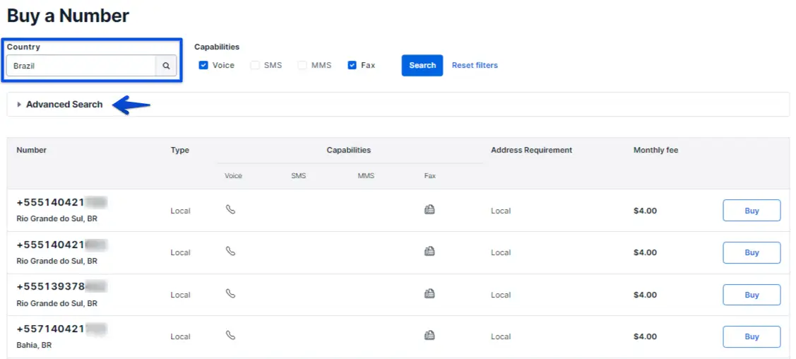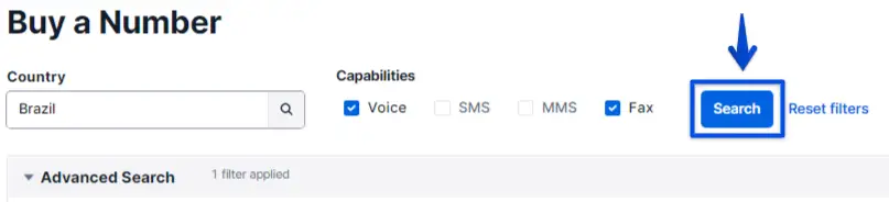 - Address requirements: algumas autoridades locais exigem que você primeiro encaminhe documentos que comprovem o endereço da empresa, antes que você consiga realizar a compra de um número de telefone. Recomendamos que você mantenha a opção Any selecionada;