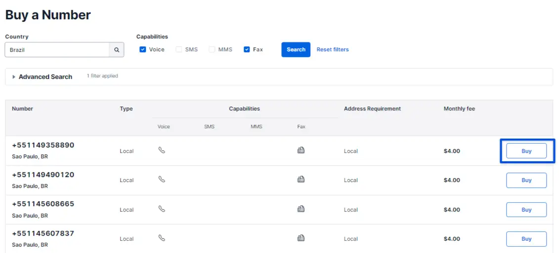 Os resultados da busca serão mostrados com o número de telefone, localização, tipo, funcionalidades, requisitos de endereço e valor da mensalidade para manter o número. Clique em Buy para comprar um número de telefone para o seu projeto atual.