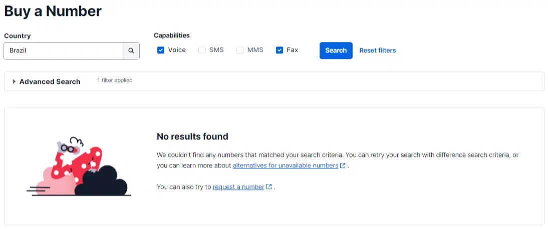 Caso o Twilio não tenha um número com o DDD que você deseja, uma página semelhante à imagem abaixo aparecerá para você.