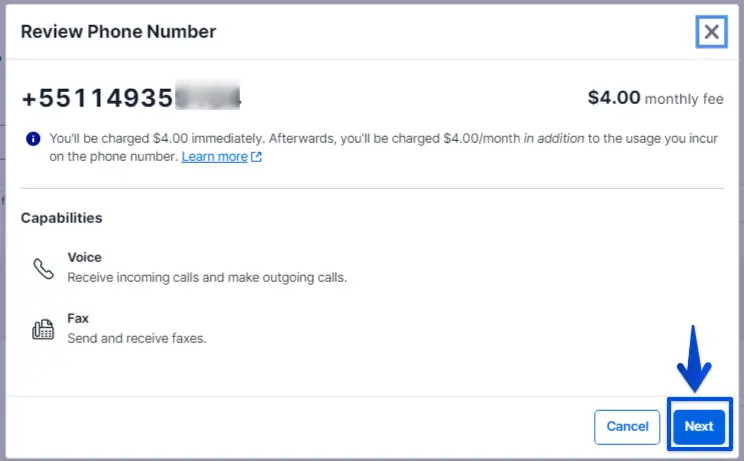 Após clicar em Buy, o Twilio te direcionará a uma página de confirmação da escolha do número. Confira se o número é mesmo o que deseja comprar e clique em Next.