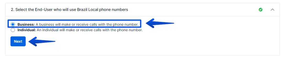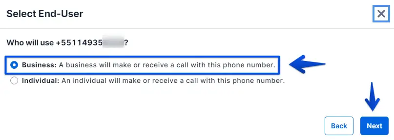 Aqui o Twilio deseja saber quem usará o número de telefone. Deixe selecionada a opção Business e clique em Next.