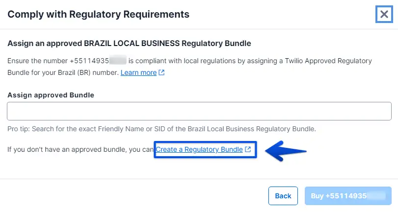 Importante: em alguns casos, após o preenchimento do Regulatory Bundle, o Twilio não processa a compra do número de telefone. Para conferir se o número está ativo em sua conta, faça o seguinte caminho em seu painel do Twilio: Explore Products > Phone > Manage > Active Numbers