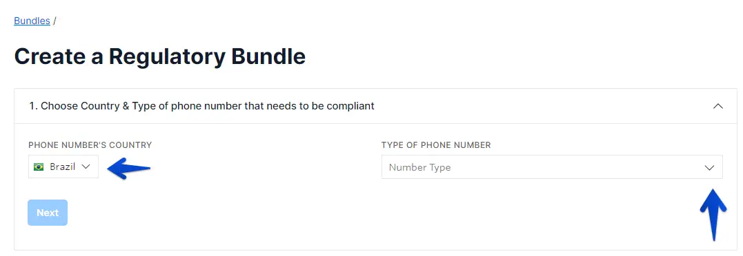 Etapa 1 do Regulatory Bundle: escolha o país de origem do número e o tipo de número de telefone (selecione a opção Local, caso o seu número e empresas sejam brasileiros).
