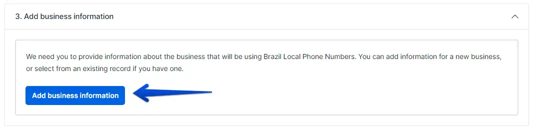 Etapa 3 do Regulatory Bundle: agora você iniciará o processo para inserir os dados da sua empresa. Clique em Add business information e siga para o preenchimento.