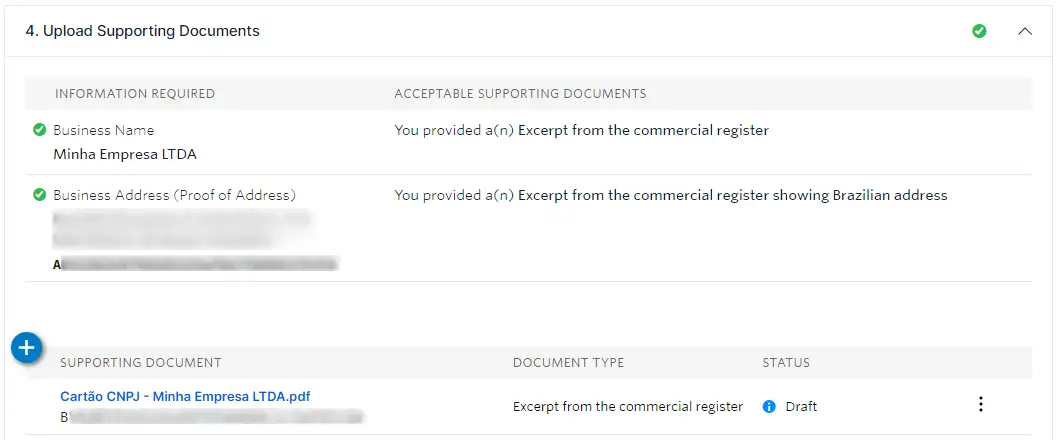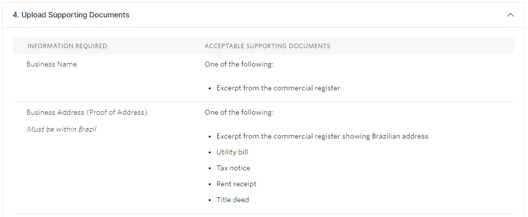 Agora você precisará criar um Regulatory Bundle e enviar informações e documentos que comprovem a existência da empresa.