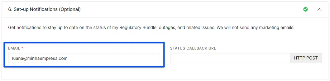 Etapa 6 do Regulatory Bundle: nessa etapa você precisará escolher um endereço de email onde você receberá as notificações referentes ao processo de aprovação da documentação da sua empresa.