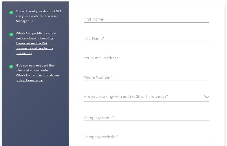 - Email Address: insira o endereço de e-mail mais apropriado para que o Twilio possa te contatar, preferencialmente um da sua empresa para que o Twilio possa te contatar rapidamente para enviar a pré-aprovação. Obrigatório