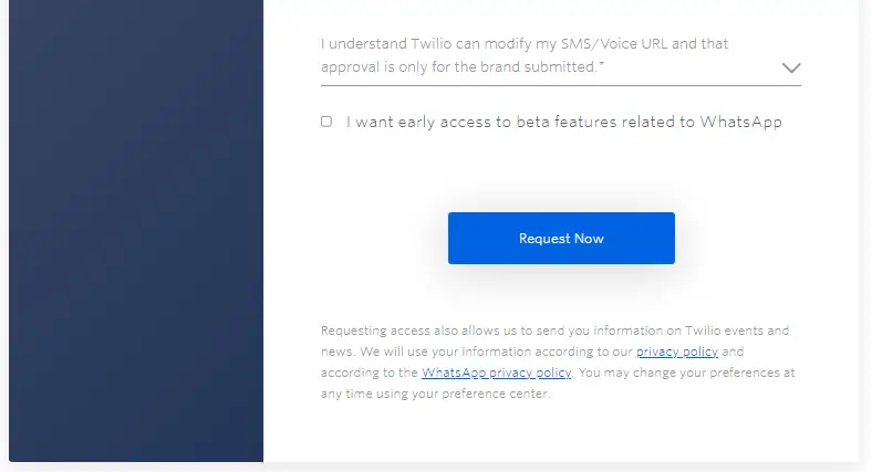 - I understand Twilio can modify my SMS/Voice URL and that approval is only for the brand submitted: selecione a opção "YES". É uma comprovação de que você concorda com os acordos propostos pelo Twilio para a habilitação de seu número para WhatsApp. Obrigatório;