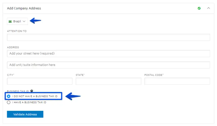 Aqui você deve preencher os dados de endereço de cobrança da empresa. Esse formulário é semelhante ao Add Company Address e recomendamos que o preenchimento de ambos seja idêntico.