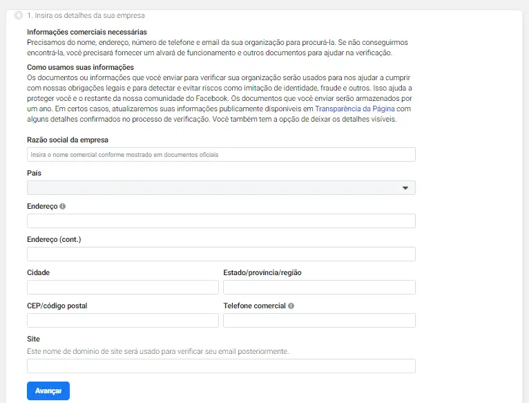 - Company Name: insira o nome da sua empresa no Brasil, preferencialmente a Razão Social. Obrigatório;
