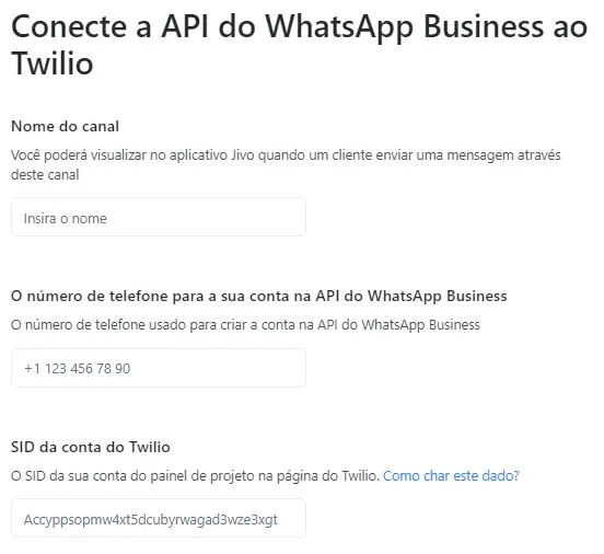 Depois do processo de verificação e aprovação junto ao Twilio e WhatsApp, você precisará apenas de 3 informações simples para conectar a integração à sua conta do JivoChat: Twilio SID, Twilio AuthToken e seu número de WhatsApp Business aprovado no WhatsApp.