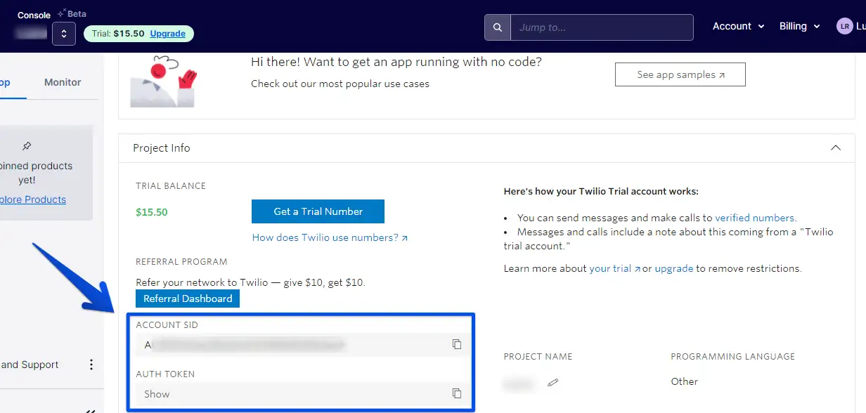 - Token de autenticação do Twilio: Para encontrar o SID da sua conta no Twilio, acesse sua conta e econtre seu SID no painel de início. Seu SID será indicado no campo AUTH TOKEN;