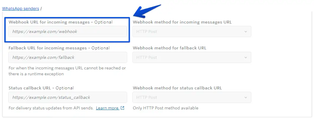 - Cole a URL gerada no campo "Webhook URL for incoming messages" na configuração de envios permitidos do WhatsApp no painel do Twilio, em: Explore Products > Message > Senders > WhatsApp Senders > Edit Sender ou diretamente clicando aqui, e SALVE as configurações realizadas.