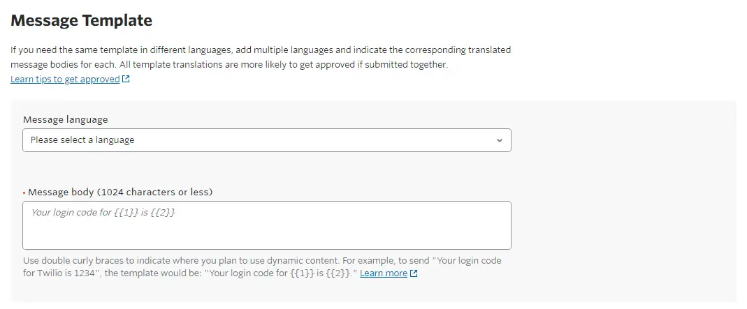 Após inserir os campos Message language e Message body, mantenha a opção None selecionada e clique em Submit message template.