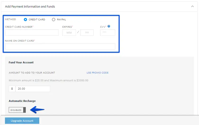 - Recharge the balance to: nessa parte você escolhe o valor a ser adicionado na recarga automática à sua conta (o valor mínimo é de USD$ 20,00 e o máximo é de USD$ 2.000,00). Obrigatório;