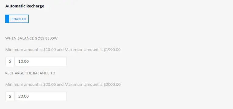 When balance goes below: aqui você precisará configurar o valor onde, caso os seus créditos estejam abaixo desse valor, a recarga automática seja ativada (o valor mínimo é de USD$ 10,00 e o máximo é de USD$ 1.990,00). Obrigatório;