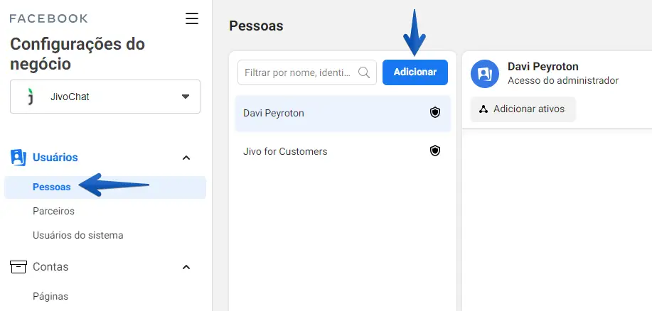 - Vá em Usuários, clique em Pessoas > Clique em Adicionar.