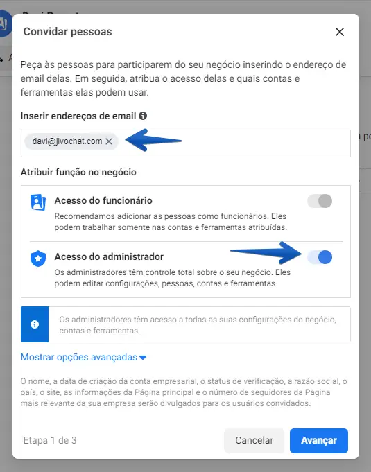 - Digite o e-mail que a nossa equipe lhe concedeu e habilite o Acesso do Administrador, então clique em Avançar.
