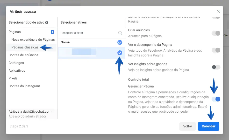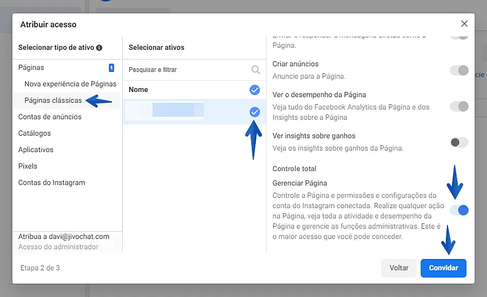 - Vá em Páginas > Páginas Clássicas > Selecione a página que deseja conceder acesso.