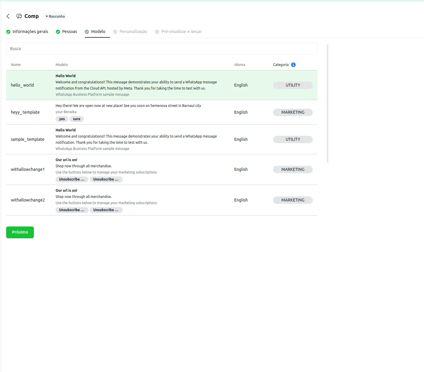 Você precisa escolher um modelo para sua campanha. Observe que você só pode selecionar um modelo sem variáveis (até a próxima atualização) e apenas em um idioma. Se você deseja enviar um modelo para um público multilíngue, crie várias campanhas.