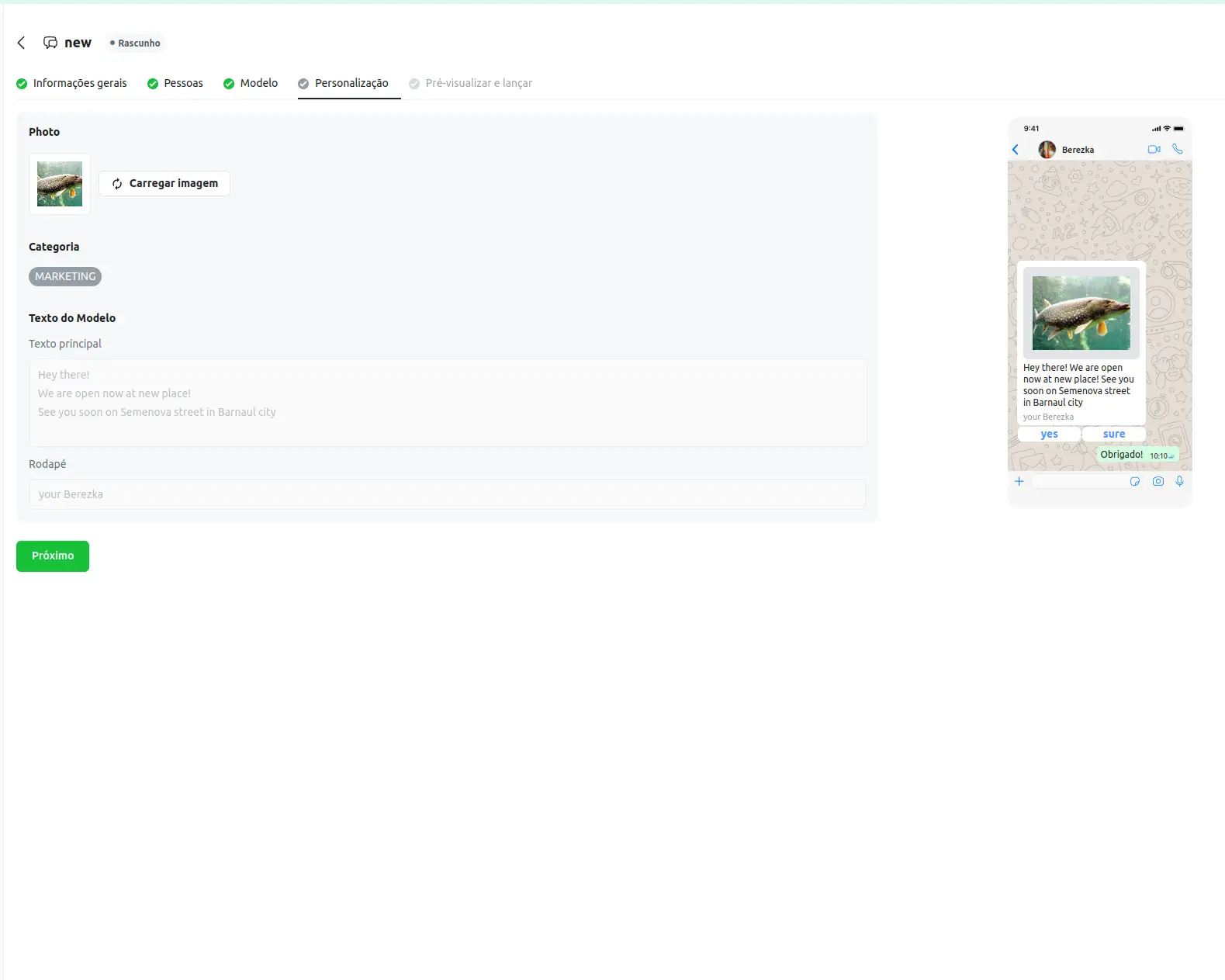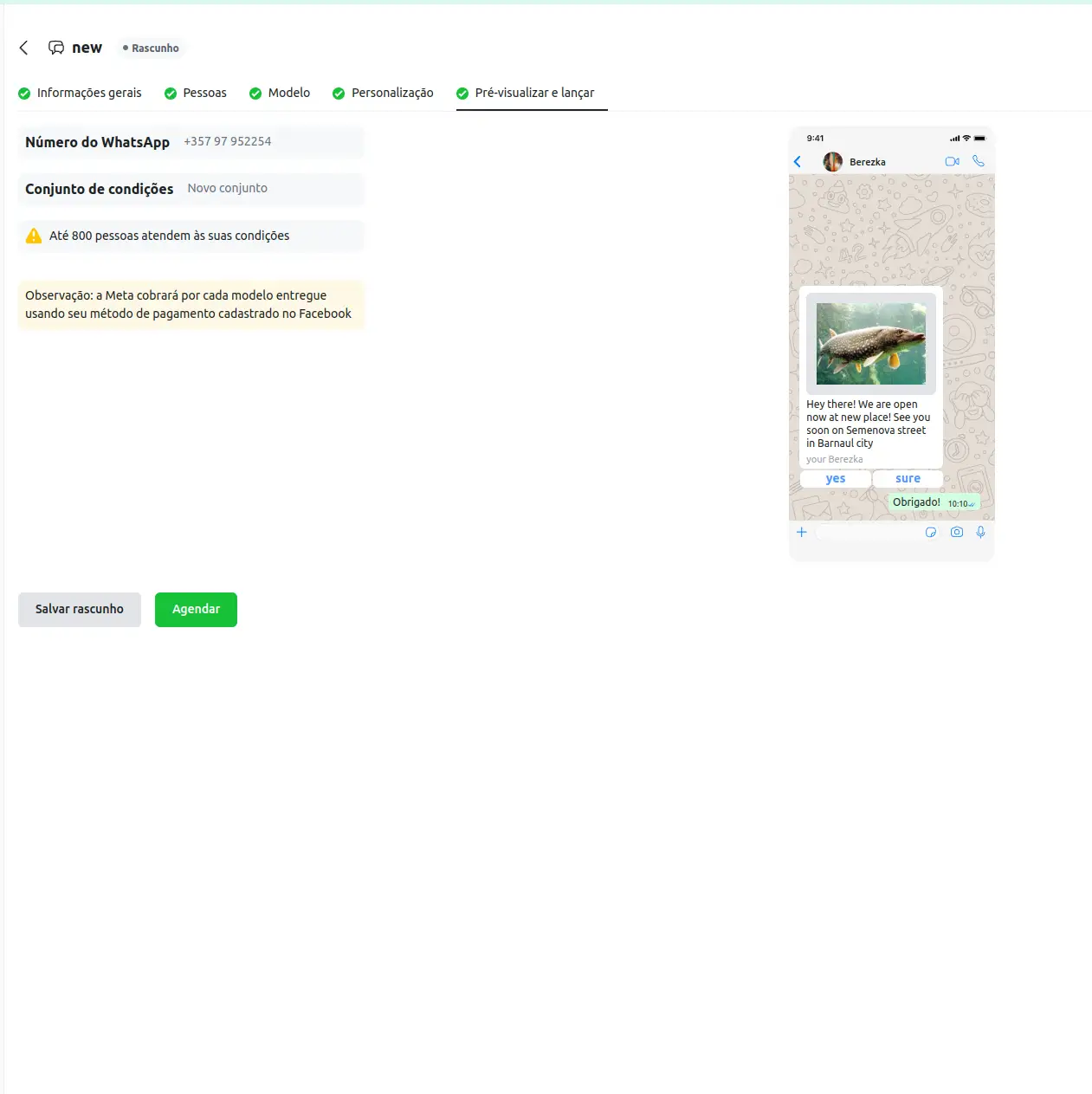 Última etapa aqui: Certifique-se de que todas as informações estão corretas: você escolheu o número certo, as condições corretas para os clientes em sua campanha e está satisfeito com a pré-visualização do modelo à direita - é assim que seus clientes irão vê-lo.