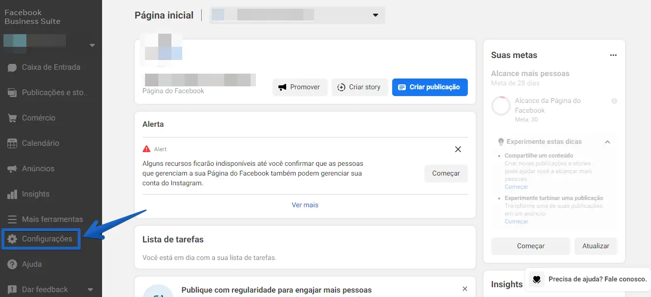 O primeiro passo é fazer o login no seu Facebook Business Manager clicando aqui. Se sua página cair no "Facebook Business Suite", basta clicar em Configurações.