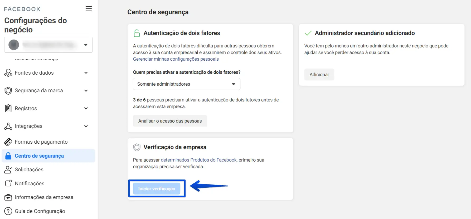 O Facebook te direcionará a uma página semelhante a da imagem abaixo. Retorne às Configurações do Negócio e verifique se o botão para verificar a página já está liberado.
