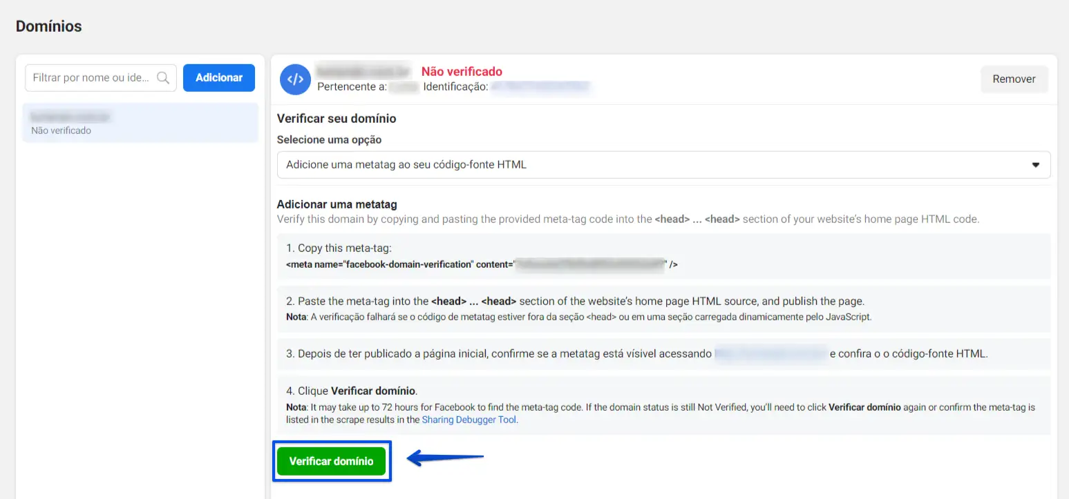 Caso a opção desejada seja via verificação de domínio, o Facebook provavelmente te mostrará a próxima imagem.