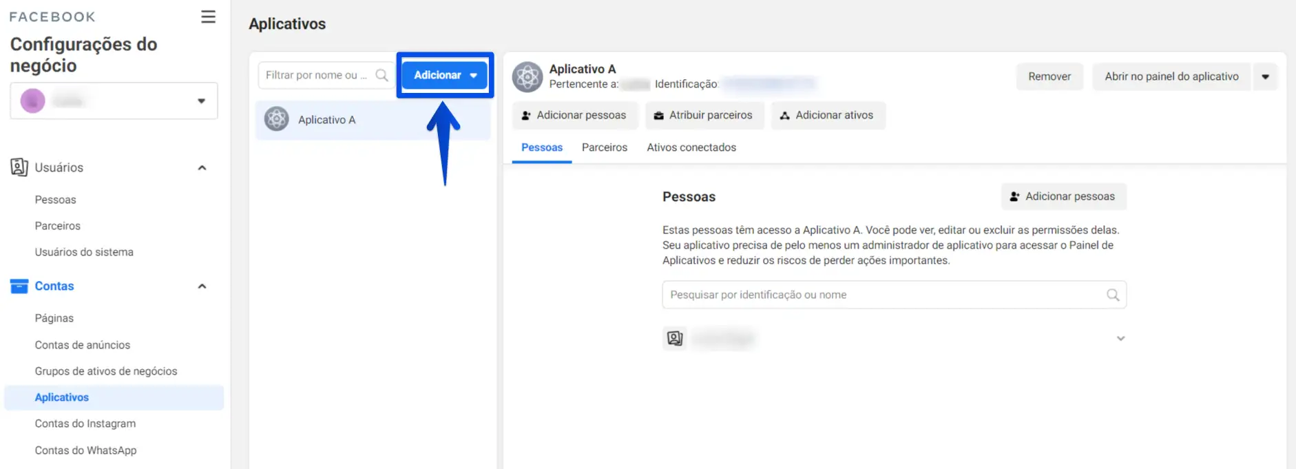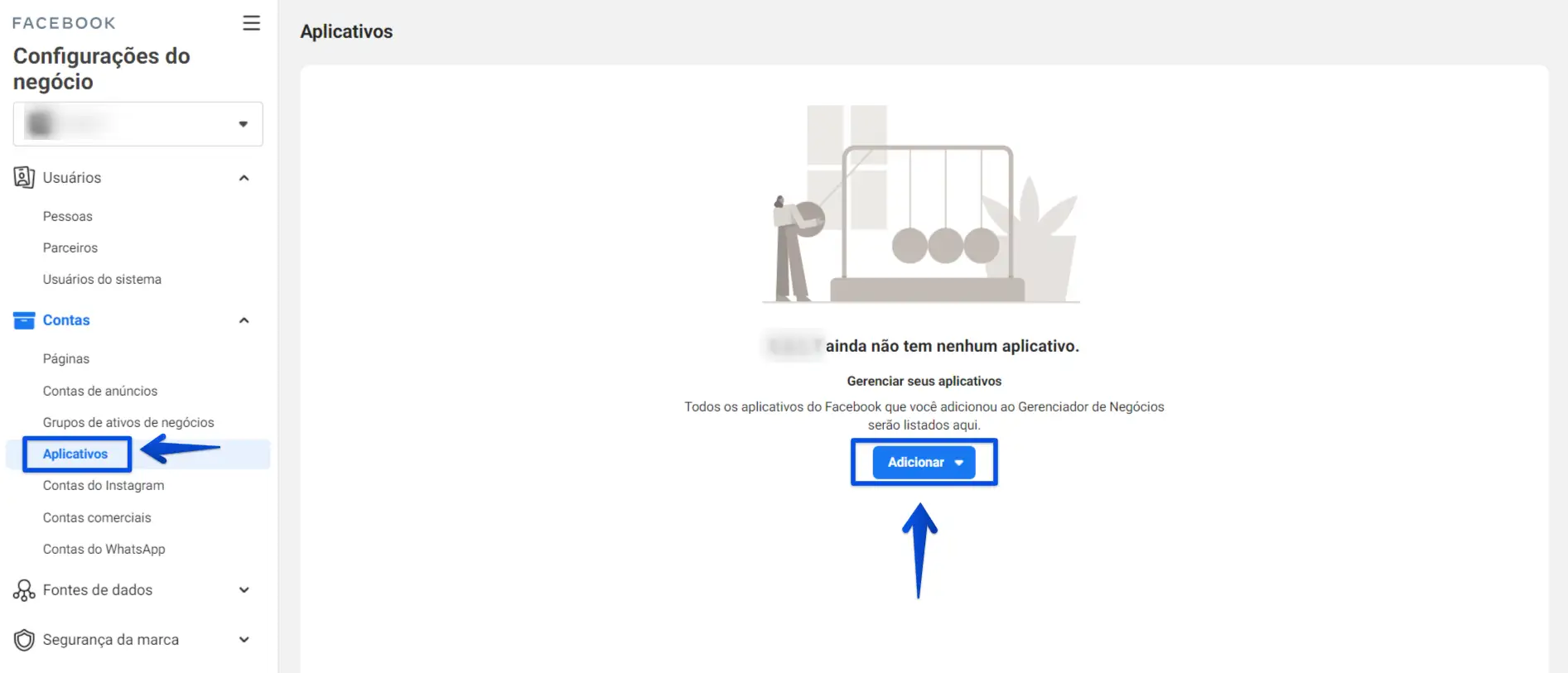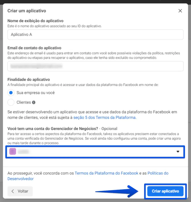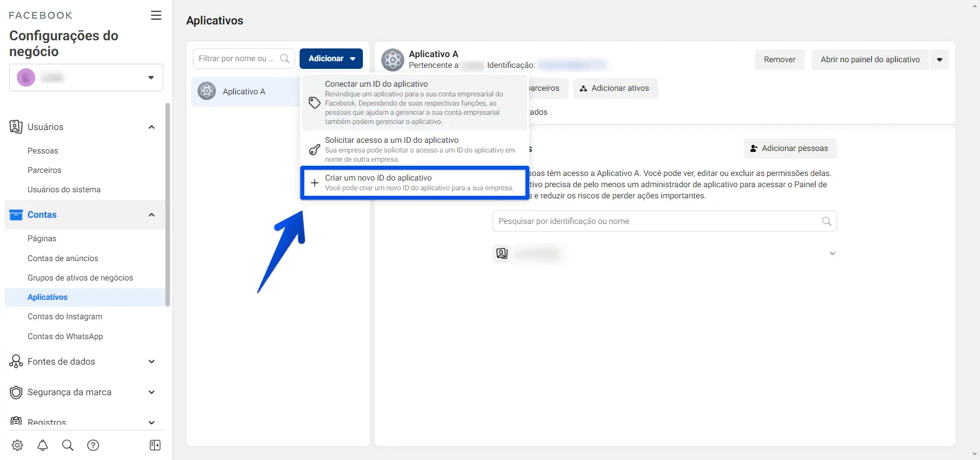 Selecione o Gerenciador de Negócios e clique em Criar Aplicativo.