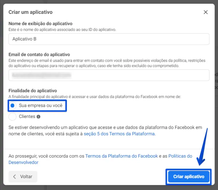 - Finalidade do aplicativo: selecione a opção Sua empresa ou você.