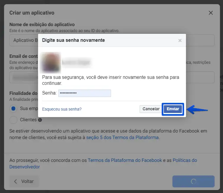 O Facebook abrirá uma janela pedindo sua senha de acesso à conta. Digite a sua senha e clique em Enviar.