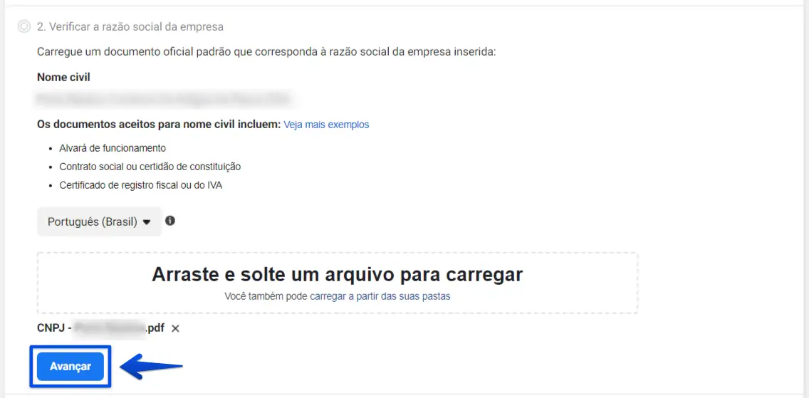 OPÇÃO B - Etapa 2 Nessa opção de template, o Facebook solicitará o cartão CNPJ da sua empresa. Selecione o idioma do documento, depois arraste o documento e solte no campo em destaque.