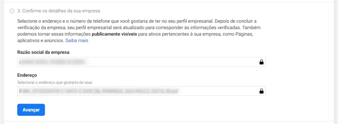 OPÇÃO A - Etapa 3 Aqui você vai precisar confirmar os detalhes da sua empresa como Razão social da empresa e Endereço. Depois disso, clique em Avançar.