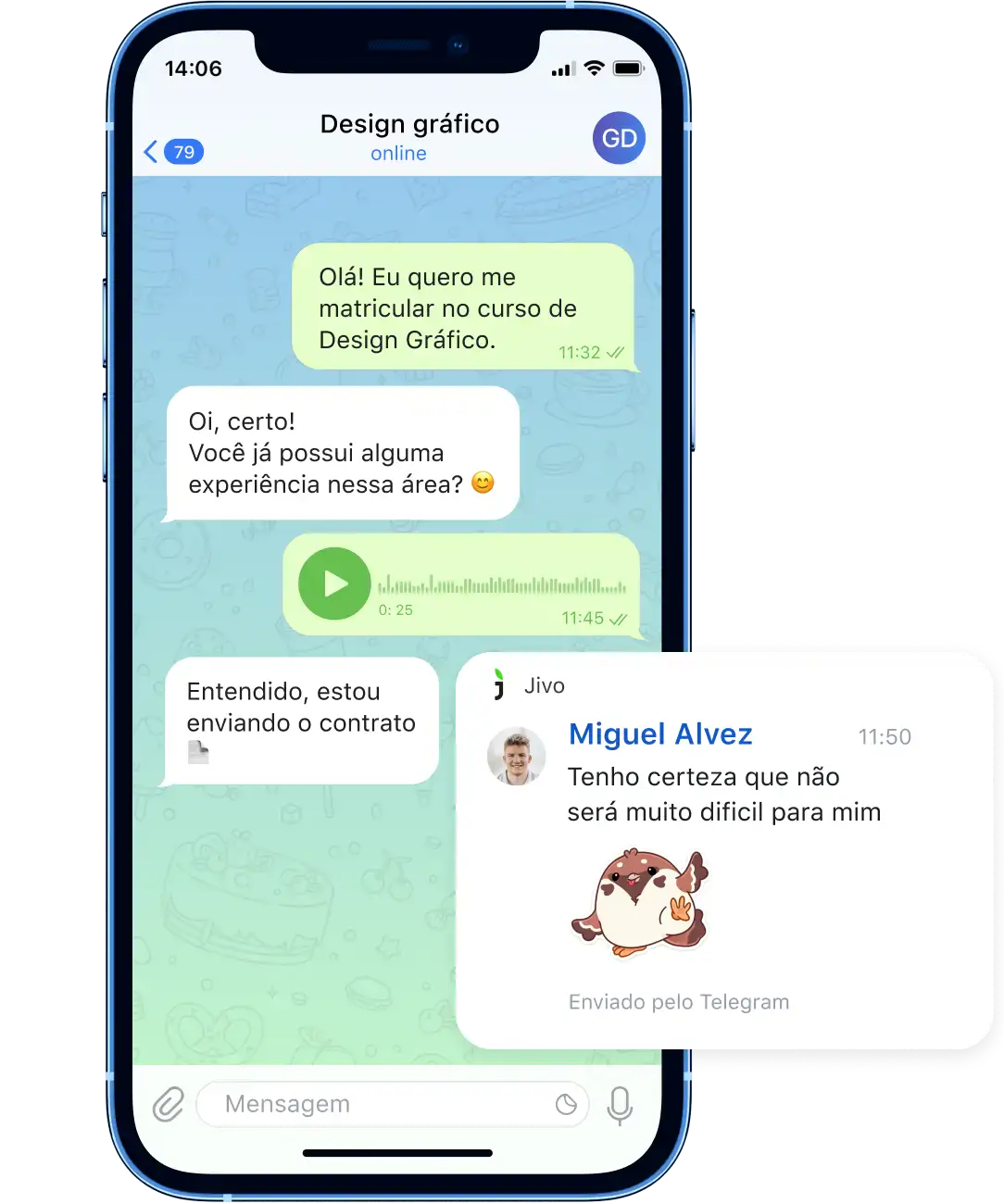 Em 2022, o Telegram passou de 700 milhões de usuários ativos. O número de downloads do aplicativo já excede 1 bilhão. Conecte o Telegram ao JivoChat para engajar seus clientes, oferecer suporte rapidamente e monitorar a qualidade do seu atendimento ao cliente.