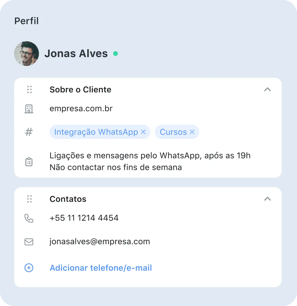 Enriqueça as suas conversas com clientes usando dados recolhidos pelo JivoChat: informações de contato, tags, categorias, comentários dos operadores, histórico de chats e muito mais